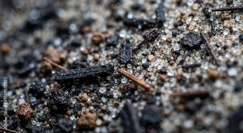 Closeup of mixed sand soil small wood fragments and shiny droplets The grains vary in size and color