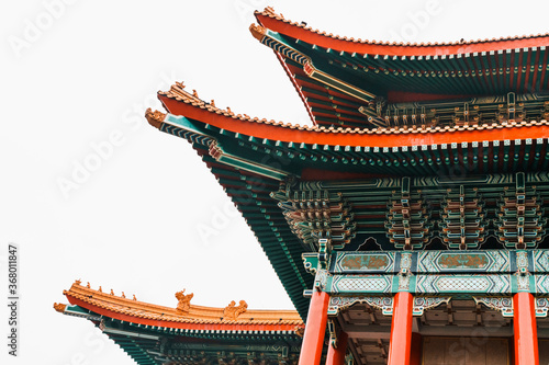 Close-up of National Theater Hall of Taiwan by the main gate on the right at National Taiwan Democracy Square of Chiang Kai-Shek Memorial Hall, travel destination in Taipei, Taiwan.