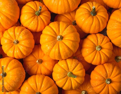 Close-up of numerous, small, vibrant orange gourds, likely pumpkins, filling the frame. The texture shows ridges & dark stems