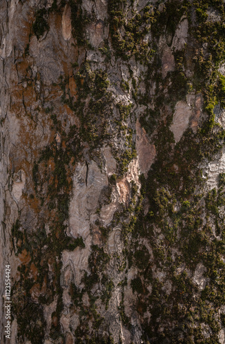 Close-up of oak bark with moss