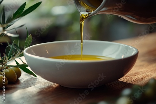 close-up of olive oil being poured into white bowl on wooden table with olives