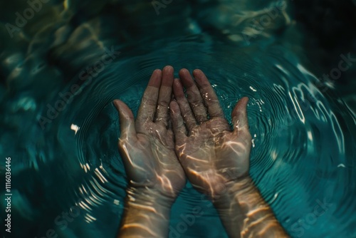 Close-up of Open Hands Cradling Water with Gentle Ripples and Shimmering Reflections in a Calm Aquatic Environment Capturing Tranquility and Connection to Nature