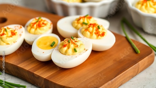 Close-up of perfectly halved deviled eggs on a rustic wooden board, garnished with paprika and fresh chives, soft natural lighting, white ceramic plate background