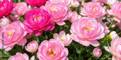 Close-up of pink and white ranunculus flowers blooming in a garden, blossom, floral