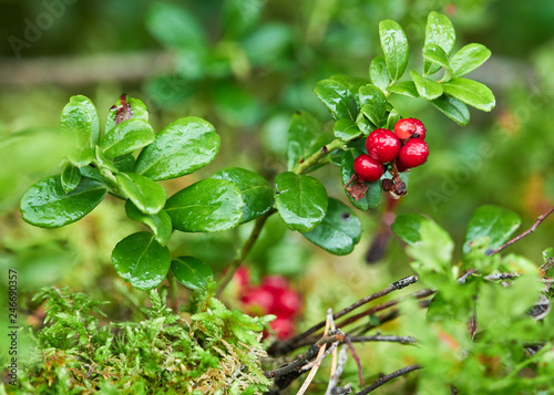 Closeup of red cowberries with leaves in a forest. Nature background. Ripe red lingonberry, partridgeberry, or cowberry grows in the pine forest. Selective focus, shallow depth of field.