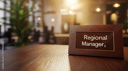 Close-up of Regional Manager Nameplate on Wooden Desk