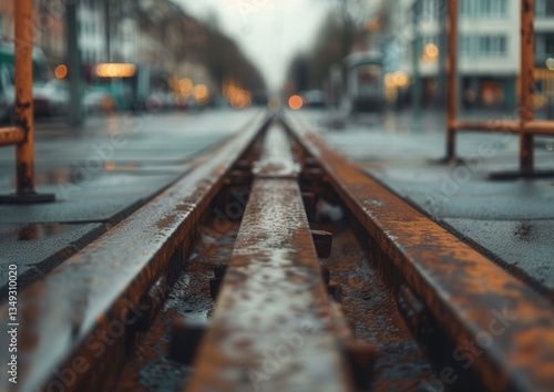 rust-eaten, urban, city landscape, blurred background, rainy, transportation, closeup, perspective, sharpened, railway, street scene, metal, environment, city landscape, railroad, urban setting, city life, industrial, rail, atmospheric, overcast, morning, city street, depth of field, transport, road, street, city, track, wet