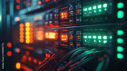Close-up of server rack with glowing lights and cables.