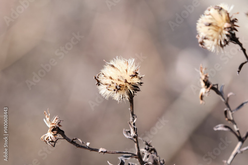 seed, head, fluffy, white, ball-shaped, delicate, feathery, texture, strand, radiating, attached, thin, dark, brown, black, stem, curved, background, blurred, light, beige, dry, grass, vegetation, out, of, sharpened, soft, lighting, natural, closeup, detail, plant, nature, outdoors, latvia