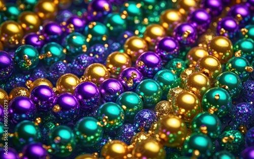 Close-up of shiny purple, green and gold metallic and glitter beads in overlapping strands with vibrant festive joyful mood