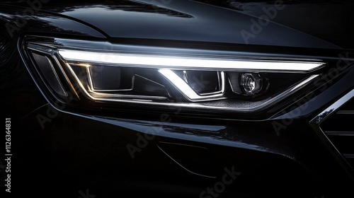 Close-up of sleek black car headlight illuminated in dark background, showcasing modern rectangular design and luxury finish