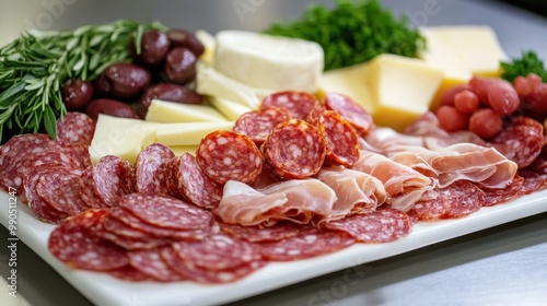 food, cheese, salami, prosciutto, party, meat, sliced, plate, platter, snack, epicure, charcuterie, catering, dinner, olive, rosemary, parsley, delicious, tasty, fresh, savoury, healthy, italian, spanish, french, mediterranean, cookery, lunch, breakfast, holiday, celebration, elegant, luxury, eatery, cafes, bar, picnic, buffet, table, setting, still life, closeup