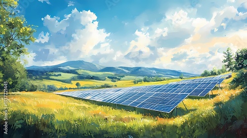 Close-up of solar panels with sun rays, symbolizing innovation in renewable power, environmental responsibility, and green electricity, ideal for clean energy campaigns, digital book illustration