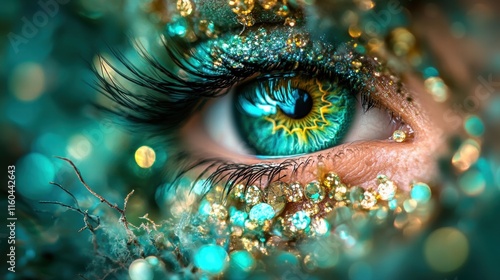 eye, closeup, macro, glistering, sparkle, teal, turquoise, gold, glamour, beauty, cosmetic, make-up, eyelash, iris, pupil, vibrant, colourful, shiny, festive, detail, woman, female, fashion, luxury, elegant, fantasy, magical, mystical, bokeh, light