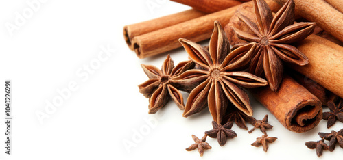 Close-up of Star Anise and Cinnamon Sticks on White Background