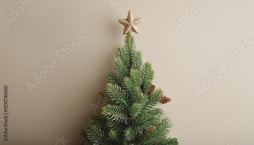 Closeup of the top of a pine christmas tree with a gold star on it _ minimal style