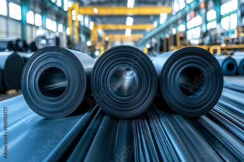 Close-up of three rolled metal sheets in a factory setting