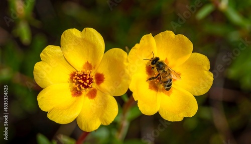 Close-up of two bright yellow flowers with a bee foraging
