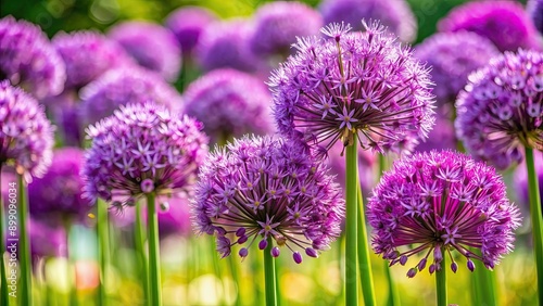 Closeup of vibrant purple garlic flowers blooming in a garden, purple, flowers, garlic, German garlic, allium, blooming, closeup