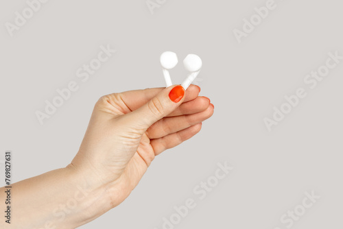 Closeup of woman hand showing white earphones for listening music, digital device. Indoor studio shot isolated on gray background.