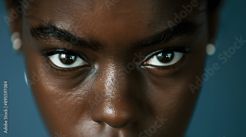 Close-up of woman with intense focus and narrowed eyes