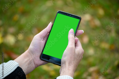 Close-up of woman's hands holding smartphone with blank green screen copy space in autumn garden. Female reading text and watching video on a mobile phone.