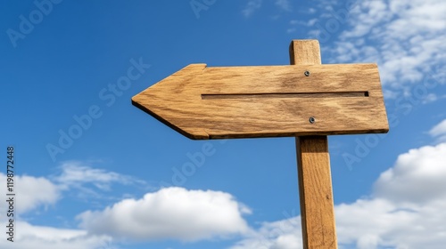 Close-up of wooden sign with arrow pointing left against a calm blue sky with a delicate cloud texture