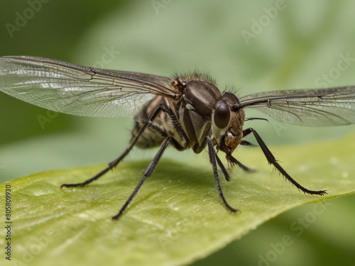 Closeup on a dance fly, Empis livida sitting on a green leaf
