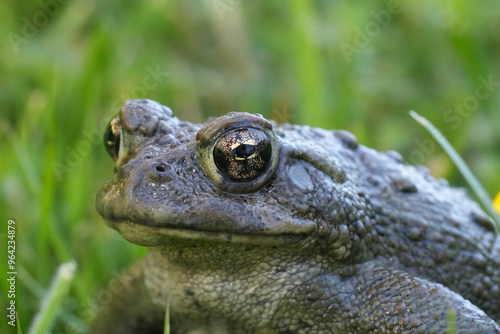 Closeup on an adult Western toad, Anaxyrus or Bufo boreas sitting on the grass
