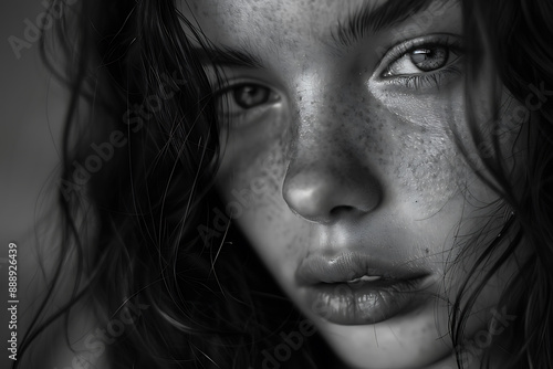 Close-up photo of a beautiful girl, capturing her radiant features and natural beauty in a detailed, expressive portrait