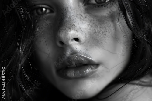 Close-up photo of a beautiful girl, capturing her radiant features and natural beauty in a detailed, expressive portrait