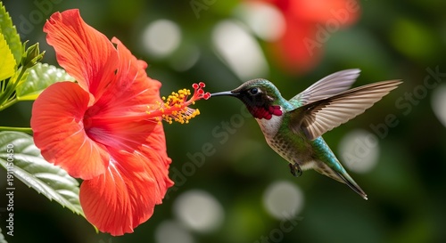 hummingbird, hibiscus, bird, flower, nectar, feeding, garden, nature, wildlife, tropical, bloom, red, green, iridescent, wing, hovering, macro, fauna, flora, pollinator, avian, sweet, summer, vibrant, blossom, bright, closeup, feather, small, creature, insectivore, perch, beauty, outdoors, plant, stamen, pistil, pollen, motion, wing, detail, natural, closeup, energy, wild, bokeh