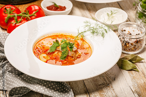 Close-up plate cabbage soup with beef, fresh tomatoes and herbs on a light wooden background. Traditional Ukrainian or Russian cuisine