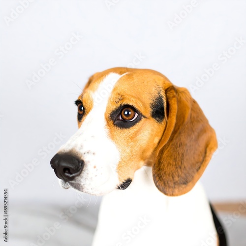 beagle, dog, portrait, closeup, animal, cute, pet, adorable, profile, brown, white, face, eye, nose, ear, mammal, looking, attentive, closeup, domestic, seated, light, background, studio