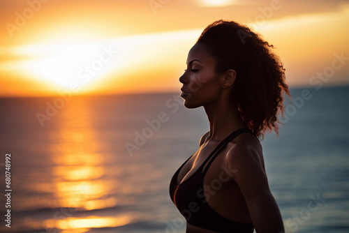 Close-up portrait of a beautiful African-American woman while walking along the seaside at sunset. Generative AI.