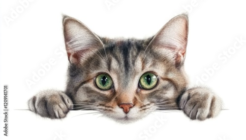 Close-up portrait of a curious cat peeking over a surface, showcasing its vibrant green eyes and soft fur