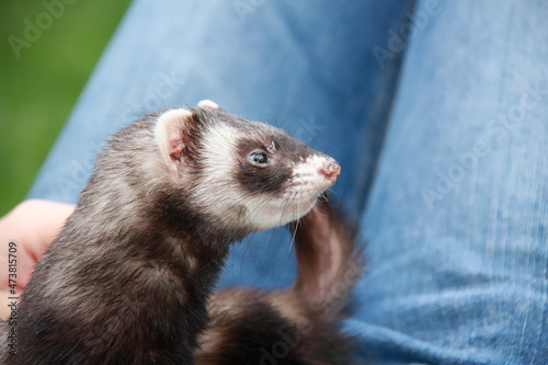 Close-up portrait of a domestic ferret resting on the knees of its owner.