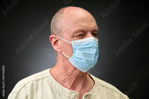 Closeup portrait of a elderly man in studio wearing a facial mask