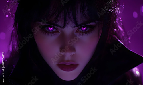 Close-up portrait of a fierce woman with vibrant purple eyes and intense expression