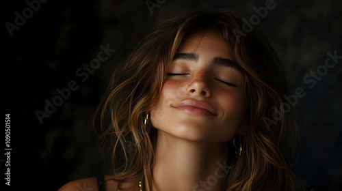 portrait, woman, freckle, eyes closed, smiling, serene, dark background, natural beauty, closeup, photo, model, face, skin, hair, brown hair, wavy hair, beauty, aesthetic, calm, peaceful, relaxed, calmness, happy, contentment, inner peace, sensual, feminine, soft light, shadow, mood, emotion, expression, feeling, atmosphere, texture, tone, style, art, image, photo, picture, visual, graphic, media, fine art, portraiture