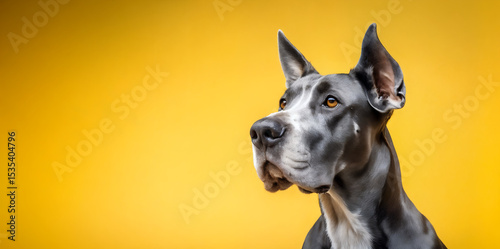 Close-up portrait of a Great Dane. Pedigree dog, studio photo. Gray dog on yellow background. portrait of a black dog