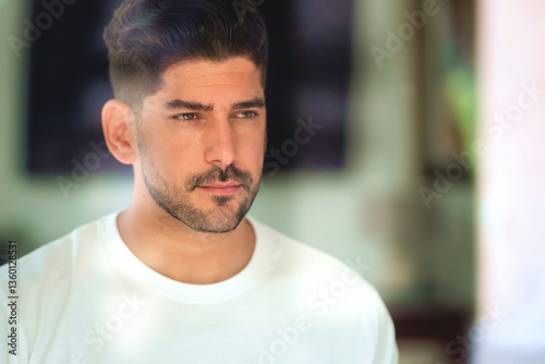 man, man, portrait, photogenic, white shirt, male, beard, stubble field, looking, one person, home interior, businessman, indoor, inside, window, people, standing, home, house, confidence, one man only, living room, casual attire, caucasian, european, lifestyle, 40s, real people, closeup, guy, 1