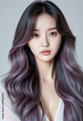Closeup portrait of a K-pop idol with long, wavy, purple ombre hair. Her skin is flawless, makeup minimal, showcasing natural beauty and hairstyle