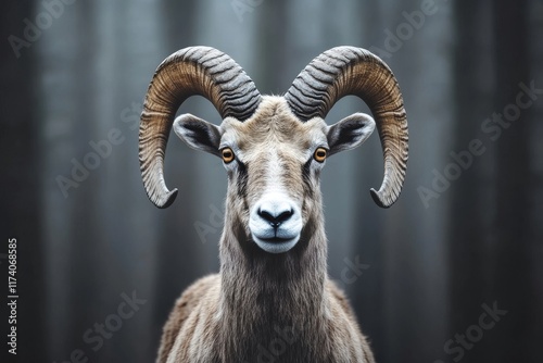 Close-up portrait of a mouflon (Ovis orientalis orientalis) featuring large horns in the Czech Republic