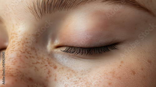 Close-up portrait of a person with eyes closed, showcasing detailed, thick, and beautifully curled eyelashes, smooth skin texture, and natural lighting. The image focuses on serene facial features and
