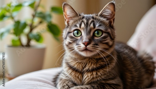 cat, pet, domestic, animal, tabby, cute, adorable, green eye, felino, closeup, relaxed, home, comfortable, whisker, interior, sofa, sitting, natural light, small, friendly