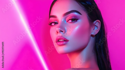 Close-up Portrait of a Woman with Neon Lighting and Pink Background