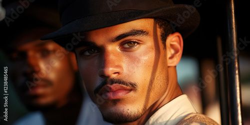 young men, fedora, hat, black hat, dark eyes, moustache, closeup, portrait, golden light, sunlight, warm light, shadow, face, expression, serious, outdoors, blurred background, facial hair, brown eyes, headwear, clothing, shirt, collar, shoulder