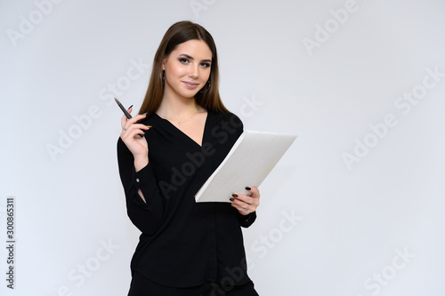 Close-up portrait of a young pretty girl secretary with long black hair in a business suit, on a white background. Standing right in front of the camera in different poses with emotions.