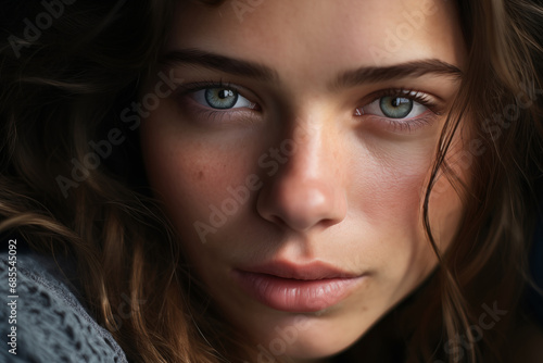 Close-up portrait of a young woman with blue eyes and natural makeup, expressing subtle emotion.